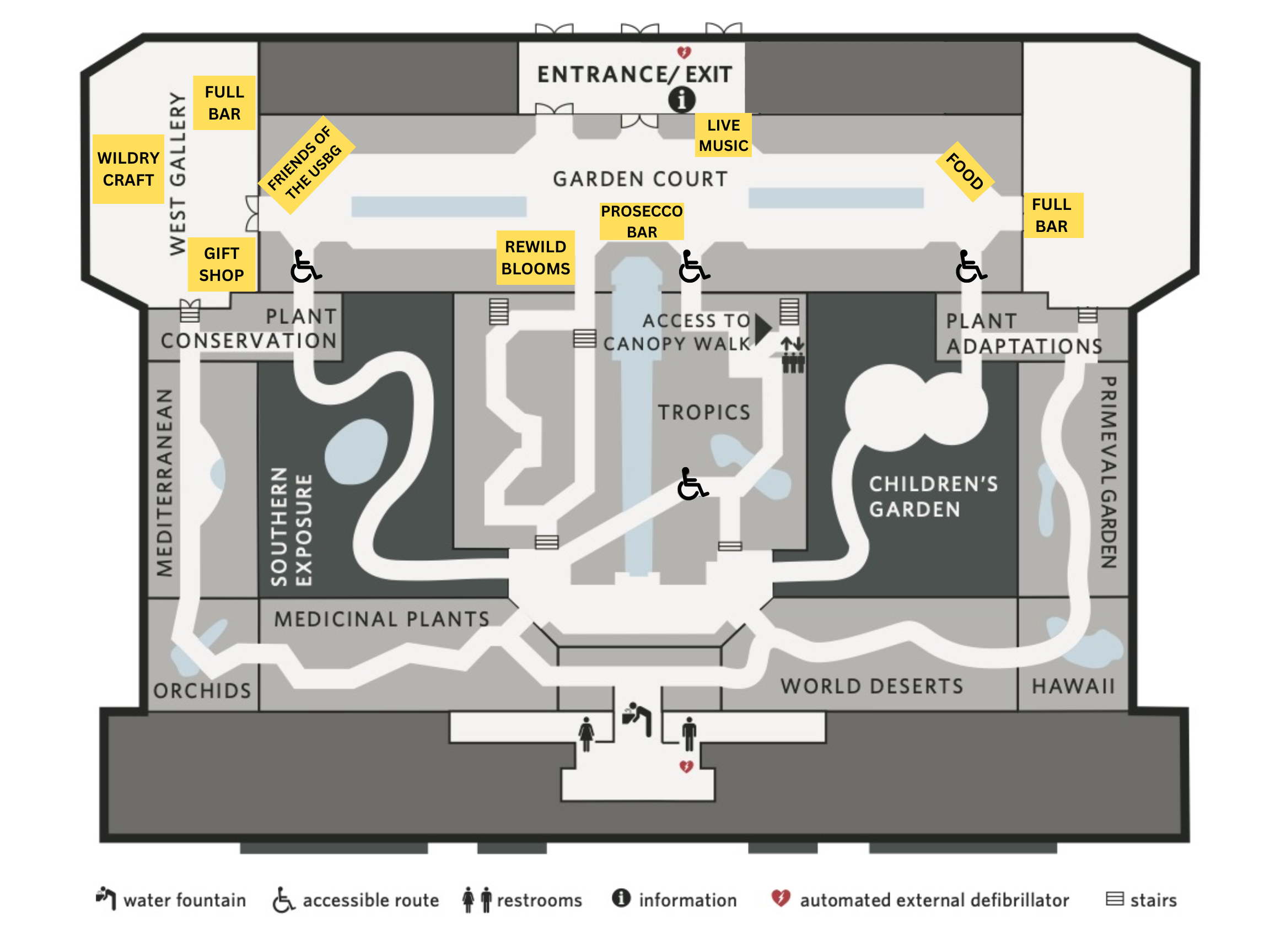 Orchids: Orchids, with their fascinating diversity of smells, shapes, colors, and pollinators help many visitors fall in love with plants. This house showcases an ever-blooming, ever-changing display of these engaging plants. The USBG orchid collection numbers about 3,000 specimens, with hundreds on display at any given time.